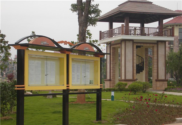 木材的宣傳欄多用在園林中,這種宣傳欄不太實用,一般只能張貼戶外寫真畫面。由于木質的宣傳欄不能把內容藏于玻璃內部,只能裸露在外面,所以內容得不到保護。